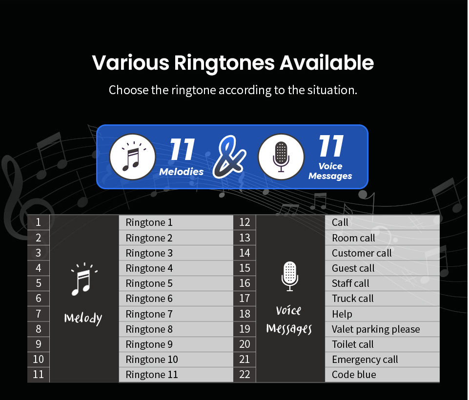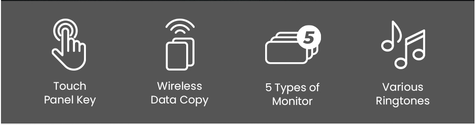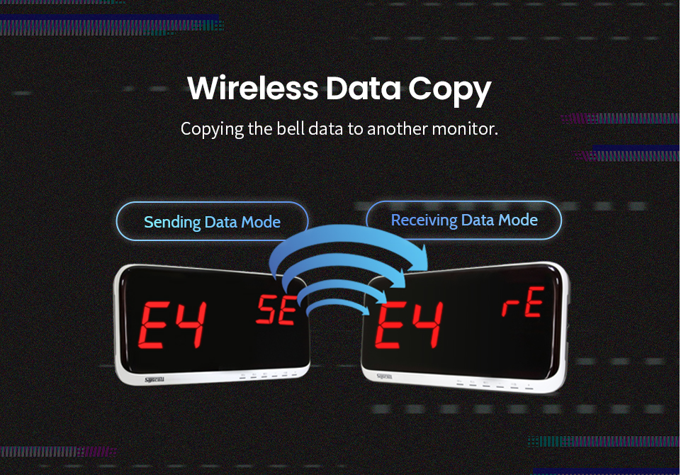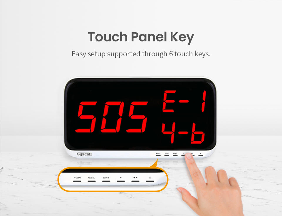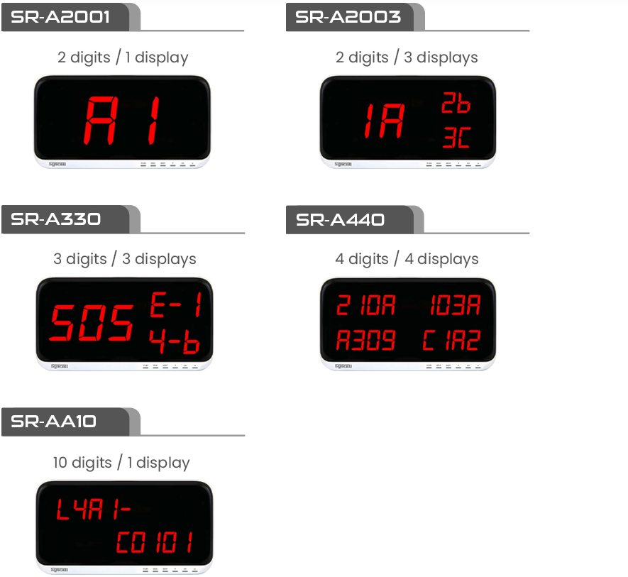 Dostępne są różne typy wyświetlania według ilość liczby znaków/ cyfr oraz ilości ostatnich powiadomień wyświetlanych jednocześnie na tablicy. Monitory charakteryzują się łatwą konfiguracją do której mamy dostęp przez 6 klawiszy dotykowych i instrukcje głosowe w języku angielskim. Istnieje możliwość wgrania oprogramowania w języku polskim. Obsługa dzięki oznaczeniom nadajników, których nazwa wyświetli się na ekranie, będzie wiedziała, które miejsce oczekuje odpowiedniej reakcji. Dostępne są monitory: