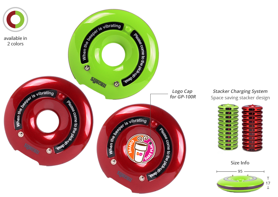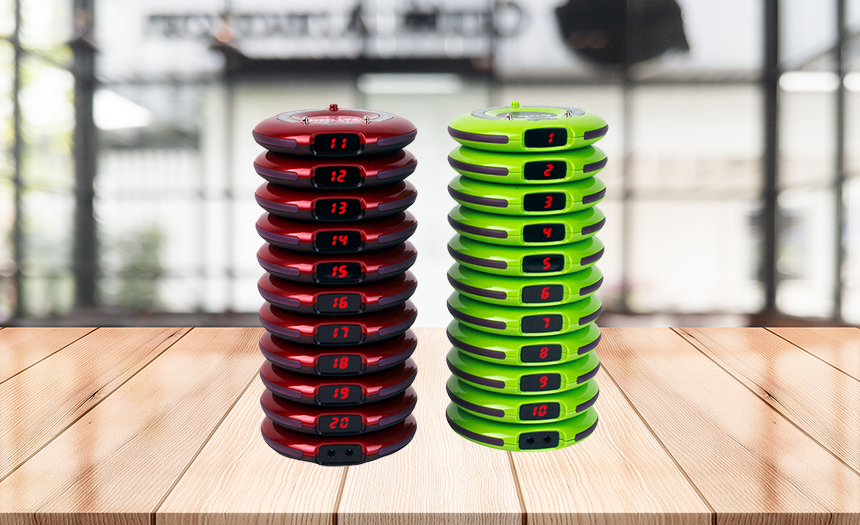 Kompaktowy pager w kształcie 'dunat' z otworem w środku z możliwością zaślepienia. Urządzenie dostępne jest w dwóch wersjach kolorystycznych: bordowym i zielonym, a jego kształ jest chętnie kopiowany przez inne firmy. W srodku pagera jest możliwość wstawienia zaślepki dzięki czemu będziesz miał możliwość umieszczenia logo lub promocji. Pagery posiadają wbudowany system anty-kradzieżowy, który aktywuje się w momencie wyjścia poza strefę. Pager wydawany jest klientowi oczekującemu na realizację jego zamówienia. Długość pracy pagera po pełnym naładowaniu to nawet 24 godziny ciągłej pracy. Kiedy zamóienie klienta jest gotowe do odbioru, obsługa wybiera jego numer, a pager sygnalizuje przywołanie wibracją i/lub dźwiękiem i/lub światłem.