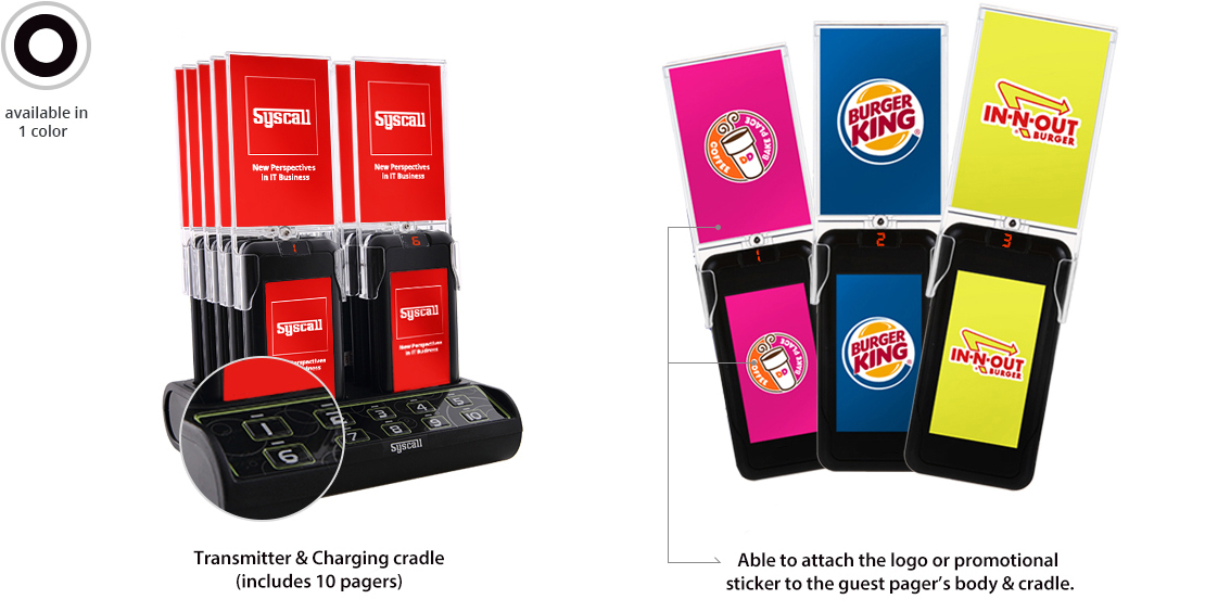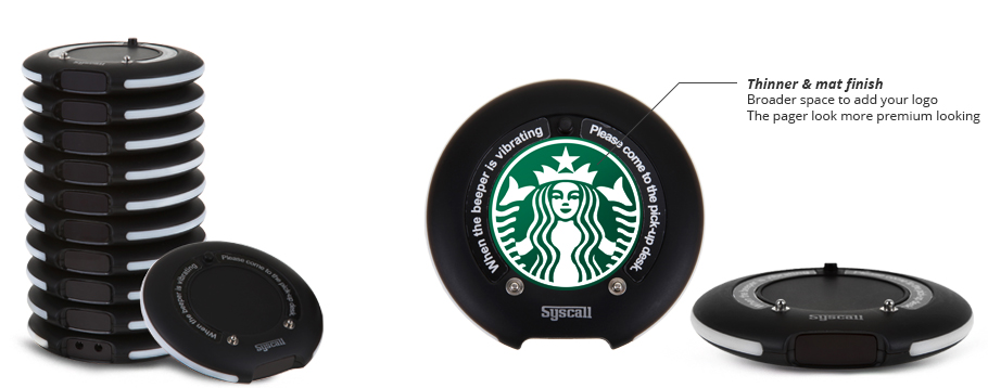 Najbardziej popularny i smykły pager na rynku z miejscem na reklamę lub promocję. Urządzenie dostępne jest w czarnym kolorze. Zewnętrzna silikonowa opaska chroni pager przed upadkiem. Pagery posiadają wbudowany system anty-kradzieżowy, który aktywuje się w momencie wyjścia poza strefę. W srodku pagera jest możliwość wstawienia zaślepki dzięki czemu będziesz miał możliwość umieszczenia logo lub promocji. Długość pracy pagera po pełnym naładowaniu to nawet 24 godziny ciągłej pracy. Pager wydawany jest klientowi oczekującemu na realizację jego zamówienia. Kiedy zamóienie klienta jest gotowe do odbioru, obsługa wybiera jego numer, a pager sygnalizuje przywołanie wibracją i/lub dźwiękiem i/lub światłem.