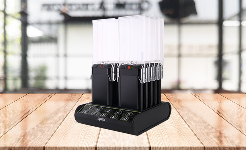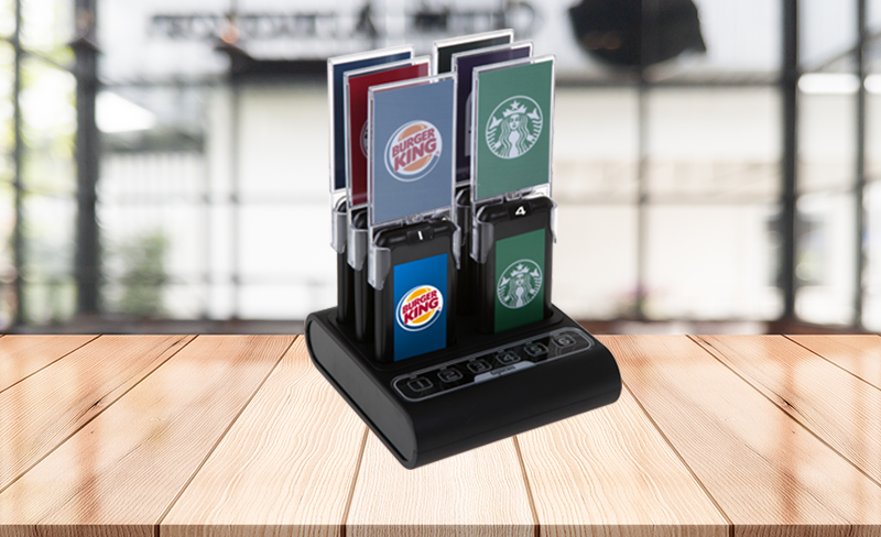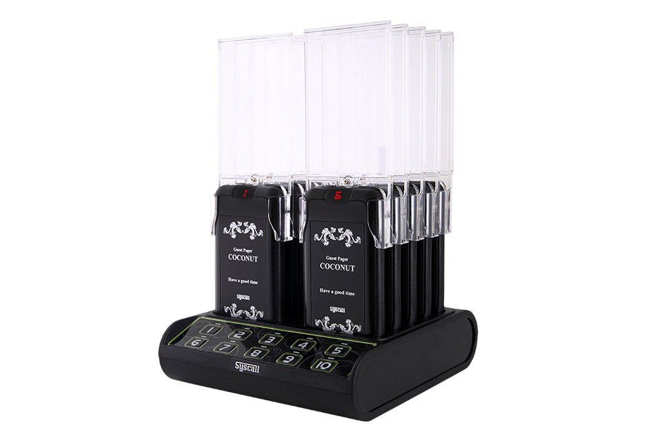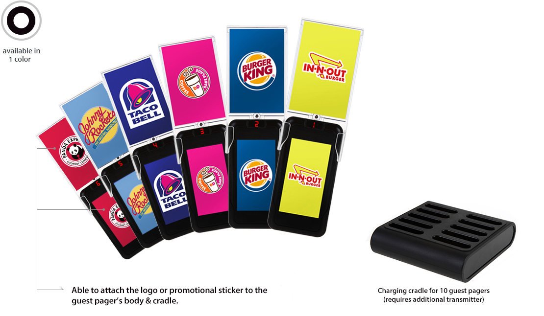 pager typu 'pocket' z dodatkowym, demontowalną powierzchnią reklamową tzw. "menu holder". Pager dzięki swojej budowie i niewielkim rozmiarom możesz włożyć do kieszeni, a regulowana głośność dzwonka umożliwia dostosowanie pagera do otoczenia. Urządzenie dostępne jest w czarnym kolorze z demontowalną nasadką. Pagery posiadają wbudowany system anty-kradzieżowy, który aktywuje się w momencie wyjścia poza strefę. Pager wydawany jest klientowi oczekującemu na realizację jego zamówienia. Długość pracy pagera po pełnym naładowaniu to nawet 24 godziny ciągłej pracy. Kiedy zamóienie klienta jest gotowe do odbioru, obsługa wybiera jego numer, a pager sygnalizuje przywołanie wibracją i/lub dźwiękiem i/lub światłem.