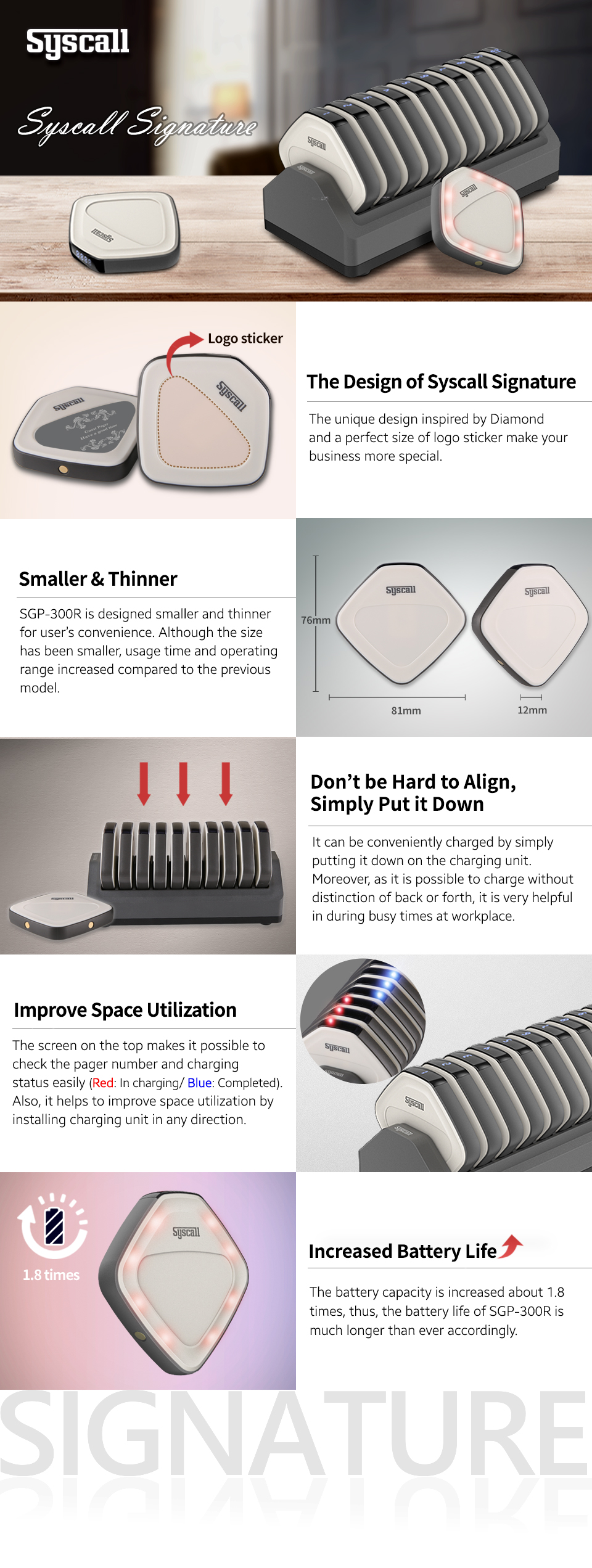 Najnowszy system pagerowy klienta zaprojektowany od podstaw z wykorzystaniem najnowszych technologii i trendów w systemach przywoławczych. Signature Guest Pager to najmniejszy pager na rynku mieści się w zamkniętej dłoni i posiada wszystkie funkcje pozostałych pagerów klienta. Aluminiowa podstawa bazy zasilającej z magentyczną, uchylną pokrywą to wygodne rozwiązanie dla konserwacji. Pagery możesz wsuwać w kieszeń dowolną stroną, dlatego nie musisz zastanawiać się czy pager jest dobrze wsunięty i się ładuje. Dostępne są dwie wersje baz zasilających z 10 lub 20 pagerami. Obudowa słupka zasilającego pagery jest kolorze srebrnym. Urządzenia posiadają wbudowany system anty-kradzieżowy, który aktywuje się w momencie wyjścia poza strefę. Stopa słupka posiada specjalną powłokę anty-poślizgową co zwiększa stabilność bazy podczas ładowania pagerów. Pager przywołujemy z transmitera GP-1000T lub GP-2000T wybierając odpowiedni numer pagera. Długość pracy po pełnym naładowaniu pagera to nawet 16h ciągłej pracy. Kiedy zamówienie klienta jest gotowe do odbioru, obsługa przywołuje pager, który wibruje i/lub wydaje dźwięk i/lub świecą się światła LED.